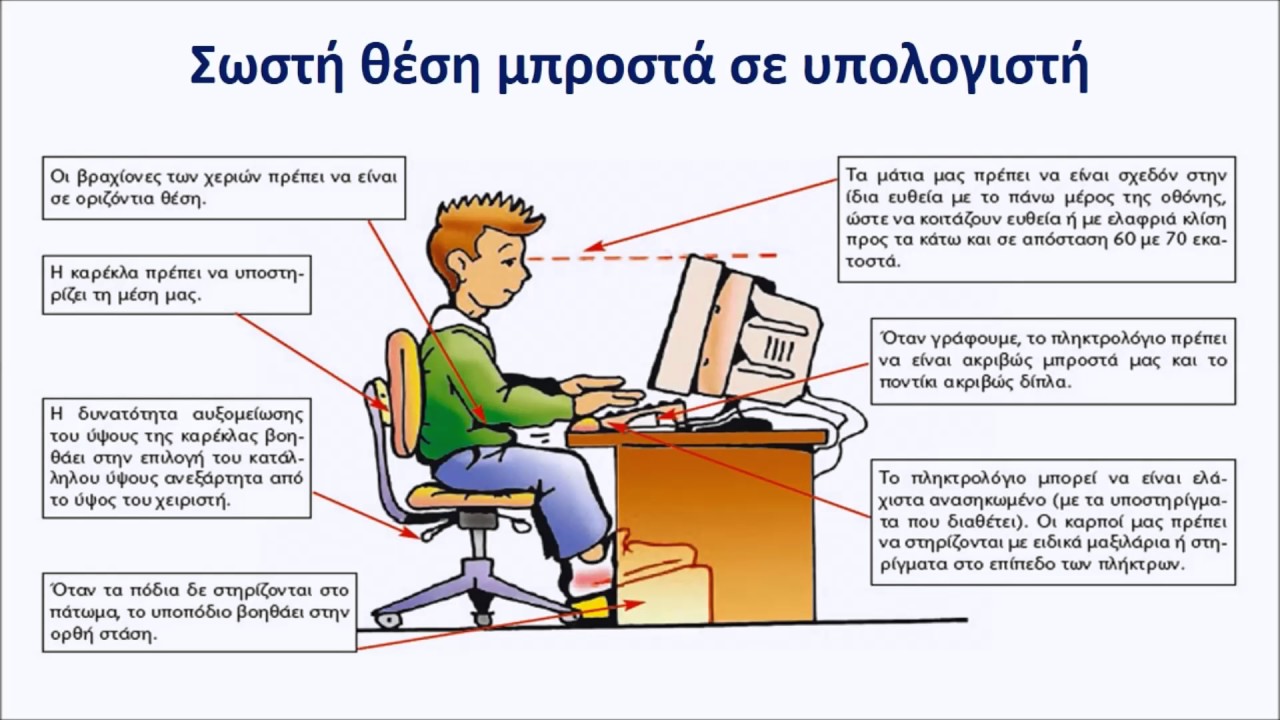 Τα παιδιά μας (όπως άλλωστε κι εμείς) περνούν πολλές ώρες μπροστά στον υπολογιστή. Συνεπώς, η σωστή θέση είναι πολύ σημαντική, ώστε να μη δημιουργηθούν στα παιδιά μακροχρόνια προβλήματα υγείας, όπως πόνοι στη μέση, στα χέρια ή σκολίωση. Ποια είναι η σωστή θέση μπροστά σε υπολογιστή Οι βραχίονες των χεριών πρέπει να είναι σε οριζόντια θέση. Η καρέκλα πρέπει να υποστηρίζει τη μέση του παιδιού. Η δυνατότητα αυξομείωσης του ύψους της καρέκλας βοηθάει στην επιλογή του κατάλληλου ύψους ανεξάρτητα από το ύψος του χειριστή. Όταν τα πόδια του παιδιού δε στηρίζονται στο πάτωμα, το υποπόδιο βοηθάει στην ορθή στάση. Τα μάτια πρέπει να είναι σχεδόν στην ίδια ευθεία με το πάνω μέρος της οθόνης, ώστε να κοιτάζουν ευθεία ή με ελαφριά κλίση προς τα κάτω και σε απόσταση 60 με 70 εκατοστά. Όταν γράφουν, το πληκτρολόγιο πρέπει να είναι ακριβώς μπροστά μας και το ποντίκι ακριβώς δίπλα. Το πληκτρολόγιο μπορεί να είναι ελάχιστα ανασηκωμένο (με τα υποστηρίγματα που διαθέτει). Οι καρποί, θα πρέπει να στηρίζονται με ειδικά μαξιλάρια ή στηρίγματα στο επίπεδο των πλήκτρων. Ποια είναι η σωστή χρήση κινητών τηλεφώνων και tablets Σε αντίθεση με τους υπολογιστές και τα laptop που τοποθετούνται πάνω σε γραφεία τα κινητά τηλέφωνα χρησιμοποιούνται κρατώντας τα στο χέρι. Γι’ αυτό, καλό θα ήταν όταν τα παιδιά χρησιμοποιούν το κινητό, να στηρίζουν τους αγκώνες πάνω σε τραπέζι. Αν δεν υπάρχει αυτή η δυνατότητα, θα πρέπει να φέρνουν την οθόνη του κινητού στο ύψος των ματιών, κλείνοντας τους αγκώνες κοντά στο σώμα σας. Όσο για το tablet που είναι μεγαλύτερο και πιο βαρύ, καλό θα ήταν να είναι τοποθετημένο πάνω σε ένα γραφείο, φροντίζοντας η οθόνη του να είναι λίγο χαμηλότερα από το ύψος των ματιών.