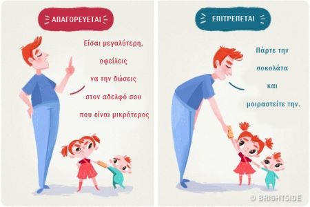 Το να μεγαλώνει κανείς σημαίνει νέες ευκαιρίες και εμπειρίες, όχι νέα καθήκοντα. Ποτέ μην πείτε στο μεγαλύτερό σας παιδί ότι επειδή είναι το μεγαλύτερο είναι και υποχρεωμένο να κάνει εκείνο τις υποχωρήσεις. Αυτό αλλοιώνει την παιδική τους ηλικία και τις σχέσεις τους με τα μικρότερα αδέλφια τους. Δεν οφείλουν τίποτα, επειδή δεν επέλεξαν να γεννηθούν πρώτα.