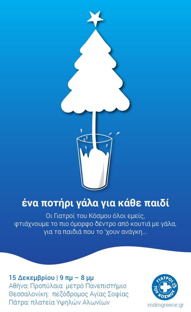 Την Παρασκευή 15 Δεκεμβρίου 2017 και για 8η συνεχόμενη χρονιά, οι Γιατροί του Κόσμου θα στολίσουν το ξεχωριστό Χριστουγεννιάτικο Δέντρο τους από κουτιά με Γάλα στα Προπύλαια (μετρό Πανεπιστήμιο) από τις 9 το πρωί έως τις 8 το βράδυ.