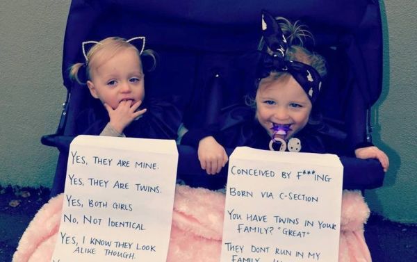 Ναι, είναι δικά μου. Ναι, είναι δίδυμα. Ναι, είναι κορίτσια. Όχι, δεν είναι μονοζυγωτικά. Ναι, ξέρω, μοιάζουν πολύ. Ναι, είμαι σίγουρη, δεν είναι μονοζυγωτικά.