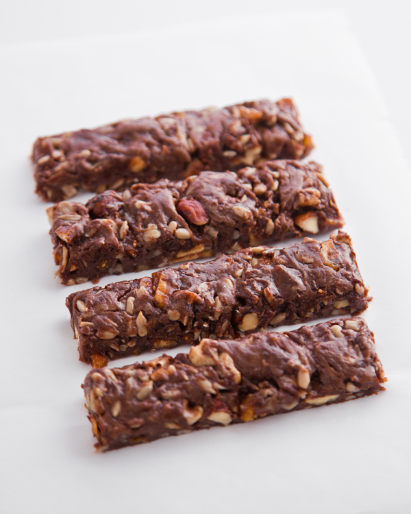 Τοποθετούμε σε ταψί μία λαδόκολλα, έτσι που να προεξέχει λίγο από το χείλος του. Ανακατεύουμε σε μεγάλο μπολ το μέλι και το ταχίνι και αναμειγνύουμε σε άλλο μπολ τα υπόλοιπα υλικά. Ρίχνουμε στο μεγάλο μπολ το μείγμα και ανακατεύουμε, μέχρι να σχηματιστεί μια κολλώδης μάζα. Απλώνουμε στο ταψί τη μάζα και τη βάζουμε στο ψυγείο για 2 ώρες. Ψήνουμε σε προθερμασμένο φούρνο για 10 λεπτά στους 180° C (στον αέρα). Αφήνουμε να κρυώσει και κόβουμε τις μπάρες. Τυλίγουμε μία μία χωριστά, πρώτα με λαδόκολλα κι ύστερα με διάφανη μεμβράνη.