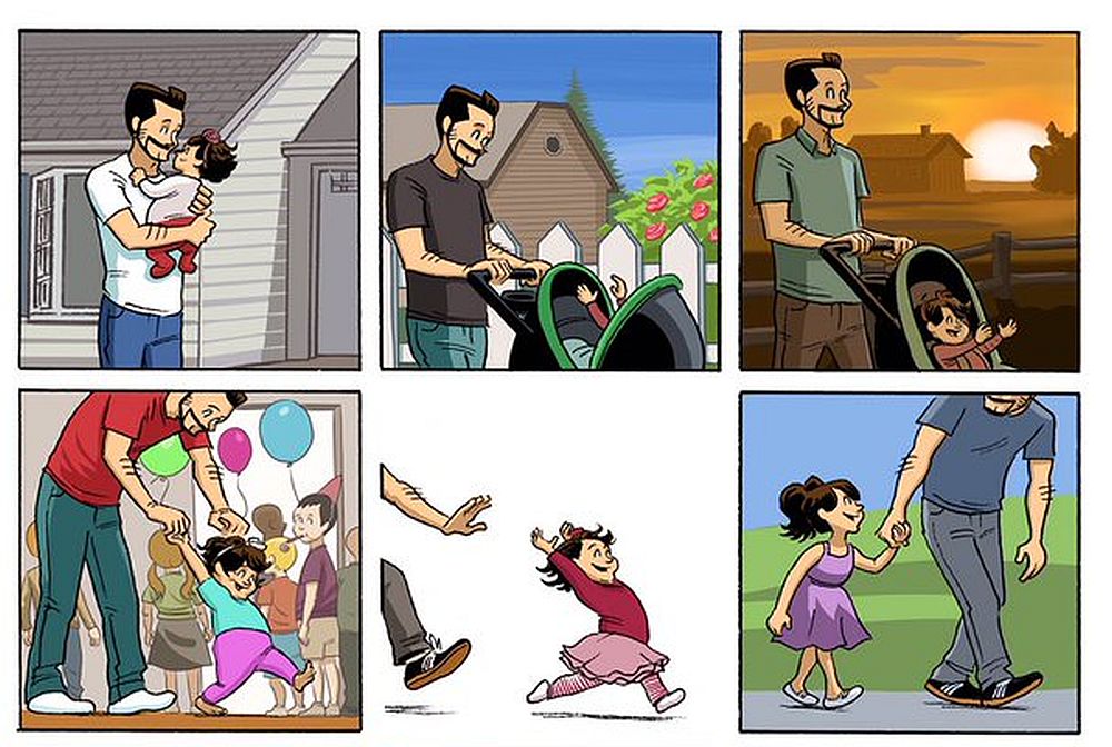 Στιγμές ανεκτίμητες που δεν γυρίζουν πίσω. Αυτό το σκίτσο ίσως θα πρέπει να λειτουργήσει σαν σειρήνα συναγερμού προς όλους εμάς που πολλές φορές χανόμαστε μέσα στην σκληρή καθημερινότητα που ζούμε και αφήνουμε να γλιστράνε μέσα από τα χέρια μας σαν την άμμο, όλες αυτές οι μικρές «μεγάλες» στιγμές των παιδιών μας. Τα παιδιά μεγαλώνουν τόσο γρήγορα που ούτε καν προλαβαίνουμε να το συνειδητοποιήσουμε πότε φεύγουν από το σπίτι. Γι’ αυτό ας προσπαθήσουμε να ζήσουμε έντονα και ουσιαστικά την κάθε στιγμή μαζί τους.