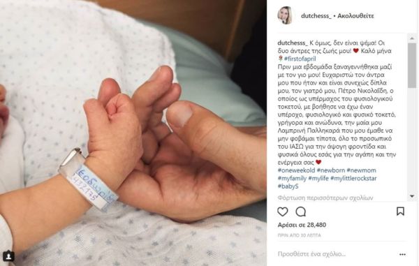 Δούκισσα Νομικού: Η πρώτη φωτογραφία του νεογέννητου γιου της…στο Instagram «Κι όμως, δεν είναι ψέμα! Οι δυο άντρες της ζωής μου!» Με αυτό το τρυφερό σχόλιο, η Δούκισσα Νομικού, «ανέβασε» στο Instagram την πρώτη φωτογραφία του γιου της.Στη φωτογραφία φαίνεται ο μικρός Σάββας να κρατά το δάχτυλο του μπαμπά του. Να θυμίσουμε ότι η Δούκισσα, έφερε την περασμένη Κυριακή στον κόσμο ένα υγιέστατο αγοράκι. Η όμορφη παρουσιάστρια έχει επιστρέψει στο σπίτι της και μαζί με τον σύζυγό της, Δημήτρη Θεοδωρίδη, ζουν τις πιο ευτυχισμένες στιγμές της ζωής του.