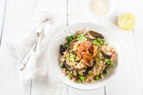 Ένα χορταστικό πιάτο με 5 υλικά, που θα εντυπωσιάσει μικρούς και μεγάλους. Επιπλέον, αποτελεί τον πιο σίγουρο τρόπο για να φάνε τα παιδιά τον αρακά τους. Υλικά 1 κρεμμύδι 6 λεπτές φέτες μπέικον, ψιλοκομμένες 300γρ ρύζι για ριζότο 1 λίτρο ζεστό ζωμό λαχανικών 100γρ κατεψυγμένου αρακά Εκτέλεση 1. Ψιλοκόψτε το κρεμμύδι. Ζεστάνετε 2 κουταλιές της σούπας ελαιόλαδο και έναν κύβο βουτύρου σε μια κατσαρόλα, προσθέστε τα κρεμμύδια και τηγανίστε μέχρι να καφετίσουν ελαφρώς (περίπου 7 λεπτά). Προσθέστε το μπέικον και τηγανίστε για άλλα 5 λεπτά, μέχρι να αρχίσει να γίνεται τραγανό. 2. Προσθέστε το ρύζι και το ζωμό και βράστε τα. Ανακατέψτε καλά, στη συνέχεια, μειώστε τη ζέστη και μαγειρέψτε, έχοντάς τα καλυμμένα, για 15-20 λεπτά έως ότου το ρύζι γίνει μαλακό. 3. Ανακατέψτε τον αρακά, προσθέστε λίγο αλάτι και πιπέρι και μαγειρέψτε για άλλα 3 λεπτά, μέχρι να μαγειρευτεί και ο αρακάς. Σερβίροντας πασπαλίστε με φρεσκοτριμμένη παρμεζάνα και φρεσκοτριμμένο μαύρο πιπέρι. Καλή σας όρεξη!