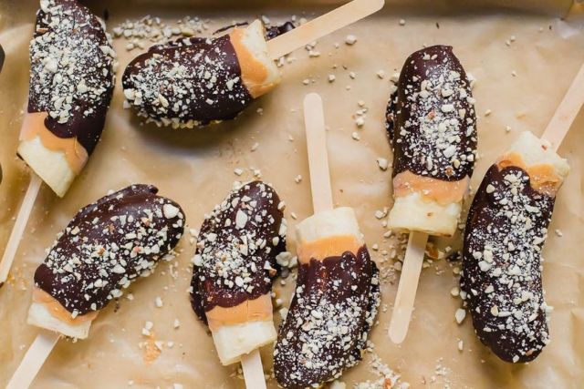 Αν τα υγιεινά επιδόρπια έχουν αρχίσει να σας νευριάζουν, τότε σας έχουμε μια πιο αξιοπρεπή και απολαυστική επιλογή, η οποία παράλληλα είναι θρεπτική. Αυτή η συνταγή ενισχύει την κλασική μπανάνα βουτηγμένη σε σοκολάτα προσθέτοντας το φυστικοβούτυρο για ένα επιπλέον επίπεδο γευστικότητας. Υλικά (για 9 μερίδες) 3 μπανάνες, κομμένες στα τρία 1 φλιτζάνι σταγόνες σοκολάτας (δοκιμάστε μαύρη σοκολάτα για περισσότερη γεύση) 2 κουταλιές της σούπας φυστικοβούτυρο 9 ξυλάκια Λαδόκολλες Εκτέλεση 1. Κόψτε τις μπανάνες σε τρία μέρη μετά το ξεφλούδισμα. Σπρώξτε απαλά ένα ξυλάκι σε κάθε κομμάτι μπανάνας. 2. Τοποθετήστε τις πάνω στη λαδόκολλα και βάλτε τις στην κατάψυξη ενώ ολοκληρώνετε τα βήματα 3-5. 3. Ανακατέψτε τις σταγόνες σοκολάτας και το φυστικοβούτυρο σε ένα μπολ. Βάλτε το μίγμα στο φούρνο μικροκυμάτων μέχρι να λιώσει. Ανακατέψτε μέχρι να γίνει ομοιογενές. 4. Ρίξτε το μίγμα σε ψηλό ποτήρι. Βγάλτε τις μπανάνες από την κατάψυξη. 5. Βυθίστε κάθε μπανάνα στο ποτήρι ώστε να καλυφθεί πλήρως. 6. Τοποθετήστε τις μπανάνες πίσω στη λαδόκολλα και ξαναβάλτε τις στην κατάψυξη. Αφαιρέστε μετά από περίπου 5 ώρες και απολαύστε! Σημείωση: Δοκιμάστε να πασπαλίσετε με θρυμματισμένα καρύδια πριν από την κατάψυξη. Ωστόσο, όχι σε όλες τις μερίδες, αφού συνήθως τα παιδιά δεν αγαπούν τέτοιες προσθήκες.
