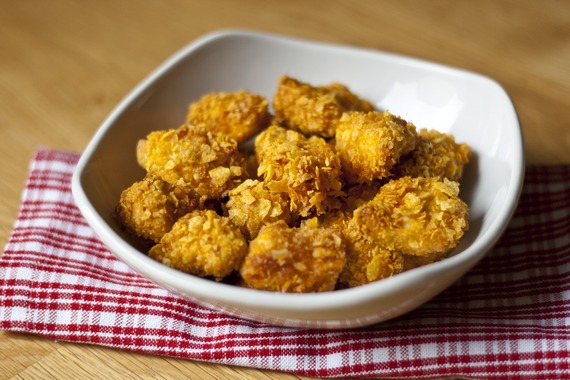 4 φιλέτα από στήθος κοτόπουλου 2 φλιτζάνια κορν φλέικς 2 αυγά ½ φλιτζάνι αλεύρι μουστάρδα αλάτι πάπρικα