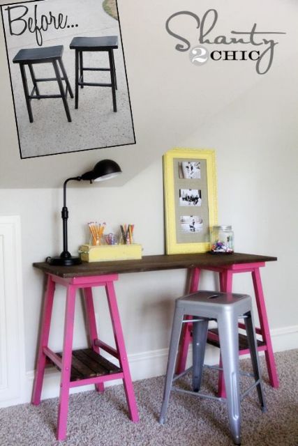 Είτε για εσάς, είτε για το παιδί είναι η πιο οικονομική και τέλεια ιδέα! Μόλις με: 2 μεγάλα ξύλινα σκαμπώ 1 ορθογώνια ξύλινη τάβλα καρφιά σφυρί Παίρνετε τα 2 μεγάλα ξύλινα σκαμπώ και τα βάφετε στο χρώμα της επιλογής σας. Τα αφήνετε να στεγνώσουν για μια ολόκληρη ημέρα. Τοποθετείται δεξιά και αριστερά του χώρου που θα φιλοξενηθεί το γραφείο και καρφώνετε προσεκτικά την ορθογώνια ξύλινη τάβλα. Έτοιμο!