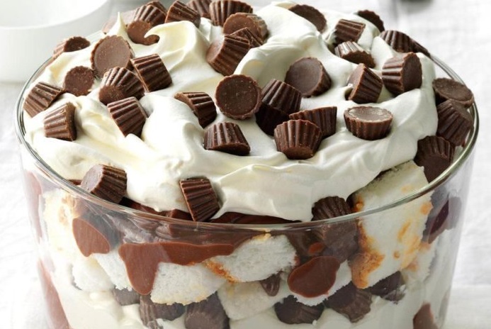 Υλικά 4 φλιτζάνια γάλα πλήρες 2 συσκευασίες μίγμα για πουτίγκα σοκολάτας 1 παντεσπάνι κομμένο σε κομμάτια 1 συσκευασία σαντιγί, αποψυγμένη Σοκολατάκια με γέμιση φιστικοβούτυρο Εκτέλεση Σε ένα μεγάλο μπολ, ανακατέψτε το γάλα και το μίγμα πουτίγκας για 2 λεπτά. Αφήστε το για 2 λεπτά ή μέχρι να μαλακώσει. Σε ένα μικρό μπολ στρώστε το μισό παντεσπάνι, την πουτίγκα, τη σαντιγί και τα σοκολατάκια φιστικοβούτυρου. Επαναλάβετε τις στρώσεις. Αφήστε το γλυκό στο ψυγείο μέχρι να σερβίρετε.