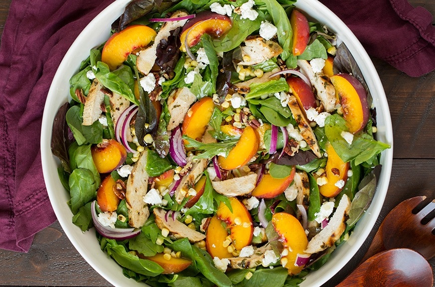 Εκτέλεση Σε ένα μπολ ανακατεύετε την πράσινη σαλάτα, τα ροδάκινα, το κρεμμύδι και τα καρύδια. Πάνω από τη σαλάτα προσθέστε τα στήθη κοτόπουλο και το τυρί. Αφού έχετε ανακατέψει όλα τα υλικά για τη σάλτσα, ρίξτε το μίγμα πάνω από τη σαλάτα και σερβίρετε.