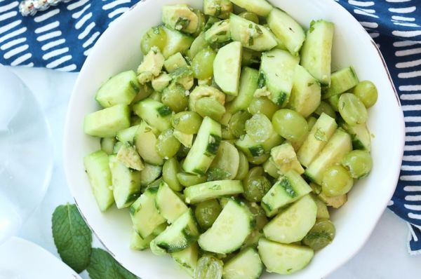 Υλικά για 4-6 μερίδες 158 θερμίδες 2 μεγάλα αγγούρια, ξεφλουδισμένα ή μη 1 αβοκάντο κομμένο σε μικρά κομμάτια Περίπου 30 ρώγες σταφυλιού, κομμένες στη μέση 2 1/2 κ.σ. ελαιόλαδο 1 1/2 κ.γ. ξύδι 1 1/2 κ.γ. λιωμένο σκόρδο 1/4 φλ. φρέσκα φύλλα δυόσμου 1 κ.γ. αλάτι Εκτέλεση Κόψτε τα αγγούρια πρώτα κατά μήκος και μετά σε κομμάτια. Τοποθετήστε τα σε ένα μπολ και ρίξτε τους αλάτι. Αφήστε τα για 20-25 λεπτά, έτσι ώστε το αλάτι να τα βοηθήσει να αποβάλουν το νερό τους. Έπειτα ξεπλύνετε το αλάτι και στεγνώστε τα αγγούρια. Ανακατέψτε τα αγγούρια, τα σταφύλια και το αβοκάντο σε ένα μεγάλο μπολ. Σε ένα μικρό μπολ ανακατέψτε το ελαιόλαδο, το ξύδι, το σκόρδο και τον δυόσμο. Γαρνίρετε τη σάλτσα πάνω από τη σαλάτα, έτσι ώστε να απλωθεί παντού. Αν θέλετε προσθέστε λίγο αλάτι. Καλή όρεξη!