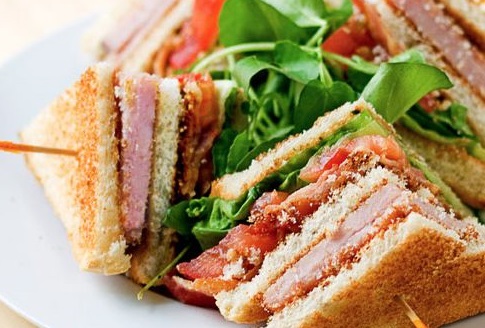 2 φέτες τυρί 1 φύλλο μαρουλιού 2 φέτες ντομάτα Μαγιονέζα 4 οδοντογλυφίδες Εκτέλεση Φρυγανίστε ή ζεστάνετε τις φέτες του τοστ ώστε να γίνουν τραγανές. Αλείψτε με μαγιονέζα την πρώτη φέτα και απλώστε το ζαμπόν, το τυρί και το μαρούλι. Αλείψτε με μαγιονέζα τη μεσαία φέτα και από τις δύο πλευρές. Αλείψτε με μαγιονέζα και την τρίτη φέτα και απλώστε το ζαμπόν, το τυρί και το μαρούλι.