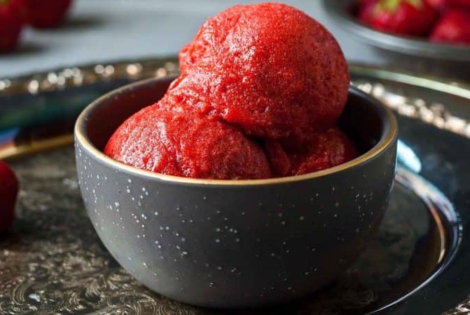 Υλικά για 4 μερίδες Θερμίδες: 333 kcal 1 κιλό φράουλες, πλυμένες και χωρίς κοτσάνια 1/4 φλιτζάνι χυμό λεμονιού 1 φλιτζάνι μέλι Εκτέλεση Ρίξτε όλα τα υλικά σε έναν επεξεργαστή τροφίμων και λιώστε μέχρι να έχετε πουρέ. Τοποθετήστε τον πουρέ φράουλας σε μια σακούλα αποθήκευσης τροφίμων και φυλάξτε τη στην κατάψυξη για μερικές ώρες. Προσεκτικά κόψτε τη γωνία της σακούλας και ρίξτε τον πουρέ σε μια παγωτομηχανή. Ακολουθήστε τις οδηγίες του κατασκευαστή. Υπολογίστε ότι θα χρειαστούν περίπου 30 λεπτά ανακάτεμα. Μεταφέρετε το μίγμα σε ένα δοχείο παγωτού και φυλάξτε στην κατάψυξη μέχρι το μίγμα να γίνει ημίρρευστο. Σερβίρετε και απολαύστε!