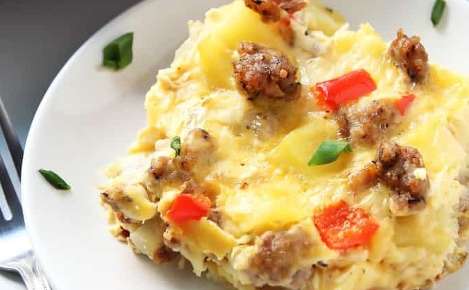 Μια εύκολη και χορταστική συνταγή. Υλικά για 6-8 μερίδες 600 γρ. πατάτες, ξεφλουδισμένες και κομμένες σε κυβάκια 1/2 κιλό λουκάνικα 1 κρεμμύδι, κομμένο σε κύβους 1 κόκκινη πιπεριά, κομμένη σε κύβους 3 σκελίδες σκόρδο, κομμένες σε κύβους 2 φλ. μαλακό τυρί, τριμμένο 6 αυγά 1/3 φλ. γάλα 1/4 κ.γ. πιπέρι Εκτέλεση Προθερμάνετε τον φούρνο στους 190 βαθμούς Κελσίου. Παράλληλα, μαγειρέψτε τους κύβους πατάτας σε καυτό, αλατισμένο νερό για 5 λεπτά. Σουρώστε και αφήστε τις να κρυώσουν. Αφαιρέστε το περίβλημα από το λουκάνικο. Ζεστάνετε ένα τηγάνι και τηγανίστε το λουκάνικο μέχρι να γίνει καφέ. Αφήστε λίγο από το λίπος του στο τηγάνι. Μαγειρέψτε στο τηγάνι το κρεμμύδι και την κόκκινη πιπεριά για 5 λεπτά. Προσθέστε το σκόρδο και μαγειρέψτε για λίγο ακόμα. Ρίξτε τα σε ένα ταψί μαζί με τα λουκάνικα και τις πατάτες. Σε ένα μπολ ανακατέψτε τα αυγά, το γάλα και το πιπέρι και ρίξτε το μίγμα στο ταψί. Προσθέστε 1 1/2 φλιτζάνι τυρί και ανακατέψτε έτσι ώστε να συνδυαστούν όλα. Ρίξτε από πάνω το υπόλοιπο τυρί. Καλύψτε με αλουμινόχαρτο και ψήστε για 20 λεπτά. Βγάλτε το αλουμινόχαρτο και ψήστε για άλλα 10-15 λεπτά. Αφήστε το να κρυώσει και σερβίρετε!
