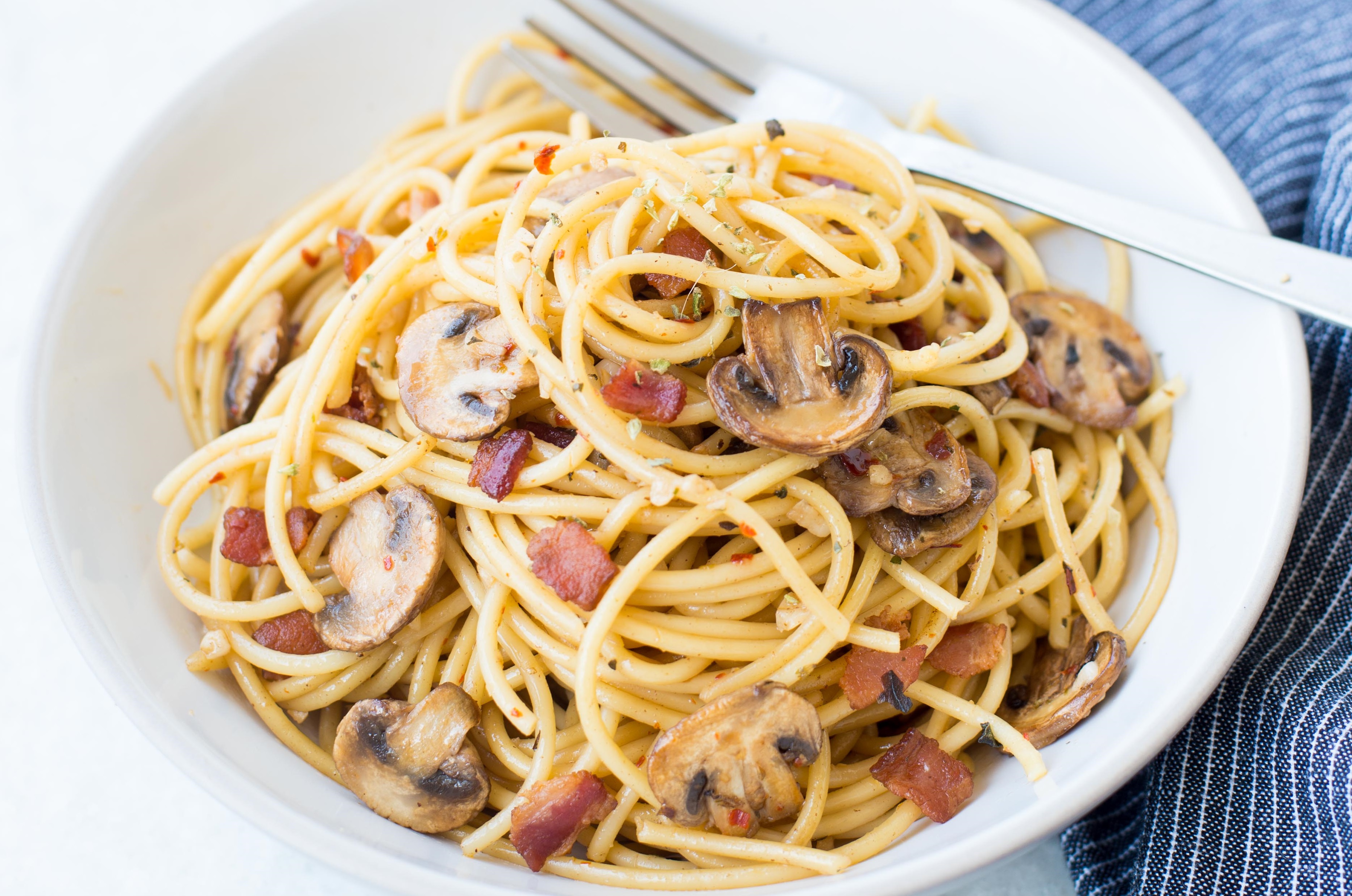Σπαγγέτι με σκόρδο, μανιτάρια και μπέικον