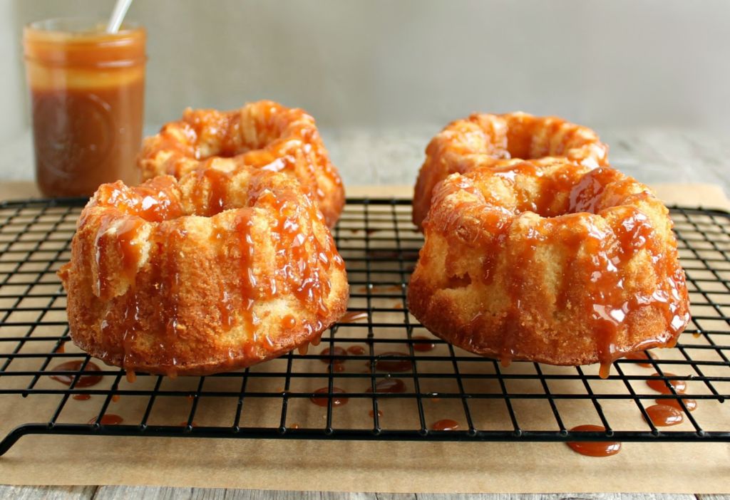 Υλικά για 8 μερίδες 200 γρ. καστανή ζάχαρη 200 γρ. μέλι 250 γρ. ηλιέλαιο 275 γρ. νερό 300 γρ. αλεύρι ½ κ.γ. τζίντζερ σε σκόνη 1 κ.γ. κανέλα, τριμμένη ½ κ.γ. γαρίφαλο, τριμμένο 2 κ.γ. μπέικιν πάουντερ 2 κ.σ. κόκκινο κρασί 1 κ.γ. σόδα 4 μέτρια αυγά 1 κ.γ. εκχύλισμα βανίλιας Εκτέλεση Προθερμάνετε τον φούρνο στους 180° C στον αέρα. Σε ένα κατσαρολάκι ρίξτε τη ζάχαρη, το μέλι, το ηλιέλαιο και το νερό και τοποθετήστε σε δυνατή φωτιά για 2-3 λεπτά μέχρι να φτάσουν σε σημείο βρασμού, να λιώσει η ζάχαρη και να γίνει ένα σιρόπι. Αφαιρέστε από τη φωτιά και αφήστε στην άκρη. Σε ένα μπολ βάλτε το αλεύρι, το τζίντζερ, την κανέλα, το γαρίφαλο και το μπέικιν πάουντερ. Ανακατέψτε με ένα κουτάλι και αφήνουμε στην άκρη. Σε ένα άλλο μπολ ρίξτε το κρασί, τη σόδα και ανακατέψτε μέχρι να διαλυθεί η σόδα στο κρασί. Αφήστε στην άκρη. Βάλτε στον κάδο του μίξερ τα αυγά, το εκχύλισμα βανίλιας και χτυπήστε τα για 2-3 λεπτά με το σύρμα στην μεσαία ταχύτητα. Ρίξτε σιγά σιγά το σιρόπι μας και συνεχίστε το χτύπημα για άλλα 3-4 λεπτά. Ρίξτε το μίγμα του αλευριού εναλλάξ με το μίγμα κρασιού στον κάδο και ανακατέψτε για 2-3 λεπτά ακόμη. Αφού ομογενοποιηθεί το μίγμα, μοιράστε το σε φορμάκια για μίνι κέικ 8 εκ με τρύπα. Γεμίστε τις φόρμες στα 2/3 του ύψους τους. Ψήστε για 30-40 λεπτά. Αφήστε να κρυώσουν πάνω σε μια σχάρα για 10 λεπτά και στη συνέχεια ξεφορμάρετε και αφήστε για άλλα 20 λεπτά να κρυώσουν εντελώς.
