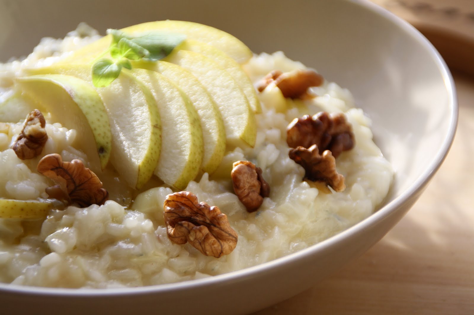 Υλικά για 4 μερίδες 400 γρ. ρύζι αρμπόριο 2 αχλάδια κάιζερ καθαρισμένα και κομμένα σε λεπτές φέτες 200 γρ. gorgonzola 3 κουταλιές μαργαρίνη 1 λίτρο ζωμό λαχανικών 1/2 ποτήρι λευκό κρασί 150 γρ. παρμεζάνα τριμμένη Αλάτι και πιπέρι Εκτέλεση Σε ένα φαρδύ τηγάνι, σε χαμηλή φωτιά, λιώστε τη μαργαρίνη και σοτάρετε ελαφρά τα αχλάδια. Αφαιρέστε τα προσεκτικά από το τηγάνι και αφήστε τα για λίγο στην άκρη. Ρίξτε στο τηγάνι το ρύζι και σοτάρετέ το για 3-4 λεπτά. Στη συνέχεια ρίξτε το κρασί, το αλάτι και το πιπέρι. Ξαναβάλτε το 1 αχλάδι στο τηγάνι και ρίξτε κουτάλα-κουτάλα μέσα στο ρύζι τον ζωμό λαχανικών, ο οποίος πρέπει να είναι βραστός. Κάθε φορά που εξατμίζεται λίγο ο ζωμός επαναλάβετε την ίδια διαδικασία ανακατεύοντας συνέχεια. Πέντε λεπτά προτού τελειώσει το βράσιμο, ρίξτε τη gorgonzola, την παρμεζάνα και το άλλο αχλάδι ανακατεύοντας. Μετά από 20-25 λεπτά περίπου από τη στιγμή που προσθέσατε το ρύζι, το ριζότο είναι έτοιμο. Αποσύρετε από τη φωτιά και σερβίρετε.