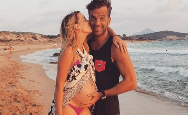 Η όμορφη παρουσιάστρια μοιράστηκε μία φωτογραφία, στην οποία είναι καθισμένη στα πόδια του συζύγου της και τον κοιτάζει με αγάπη, ενώ τριγύρω τους βρίσκονται τα δώρα για τον νεογέννητο γιο τους.