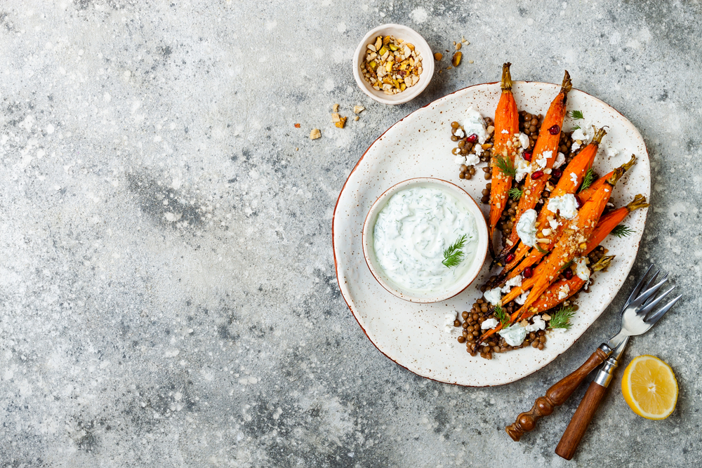 - Στο μεταξύ, ανακατέψτε τα υλικά για τη σος γιαουρτιού και συνοδεύστε τα καρότα.