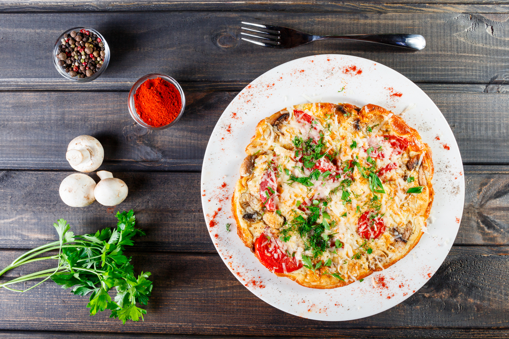 Κάψτε το λάδι σε τηγάνι σε μεσαία φωτιά. Προσθέστε το κρεμμύδι και ανακατέψτε το μέχρι να μαλακώσει. Βάλτε τα μανιτάρια και το κολοκύθι και ανακατέψτε για άλλα 7 λεπτά. Ανακατέψτε τα λαχανικά στο τηγάνι και ρίξτε το μείγμα του αυγού από πάνω και μην ανακατεύετε.