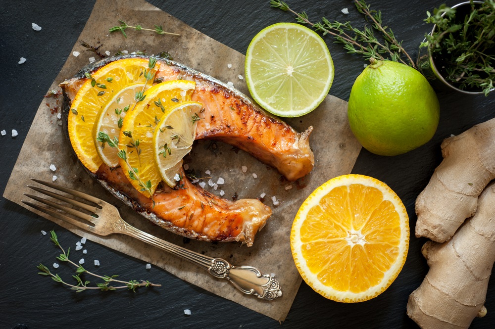 Πλένετε και σκουπίζετε καλά τις φέτες σολομού. Φτιάχνετε μαρινάδα ανακατεύοντας το ελαιόλαδο, το λεμόνι, τον χυμό πορτοκαλιού, το λικέρ, τη ρίγανη, το αλάτι και το πιπέρι. Βάζετε τις φέτες του σολομού στη μαρινάδα και τις γυρίζετε, ώστε τα υγρά της μαρινάδας να έρθουν σε επαφή με όλες τις πλευρές τους. Σκεπάζετε τις φέτες και τις βάζετε στο ψυγείο για 3-6 ώρες. Στη συνέχεια, στρώνετε ένα ταψί με λαδόχαρτο, στραγγίζετε τις φέτες και τις τοποθετείτε στο ταψί. Βάζετε πάνω από τον σολομό φέτες πορτοκαλιού και λεμονιού και ψήνετε σε προθερμασμένο φούρνο, στους 180° C, για 15-20΄.