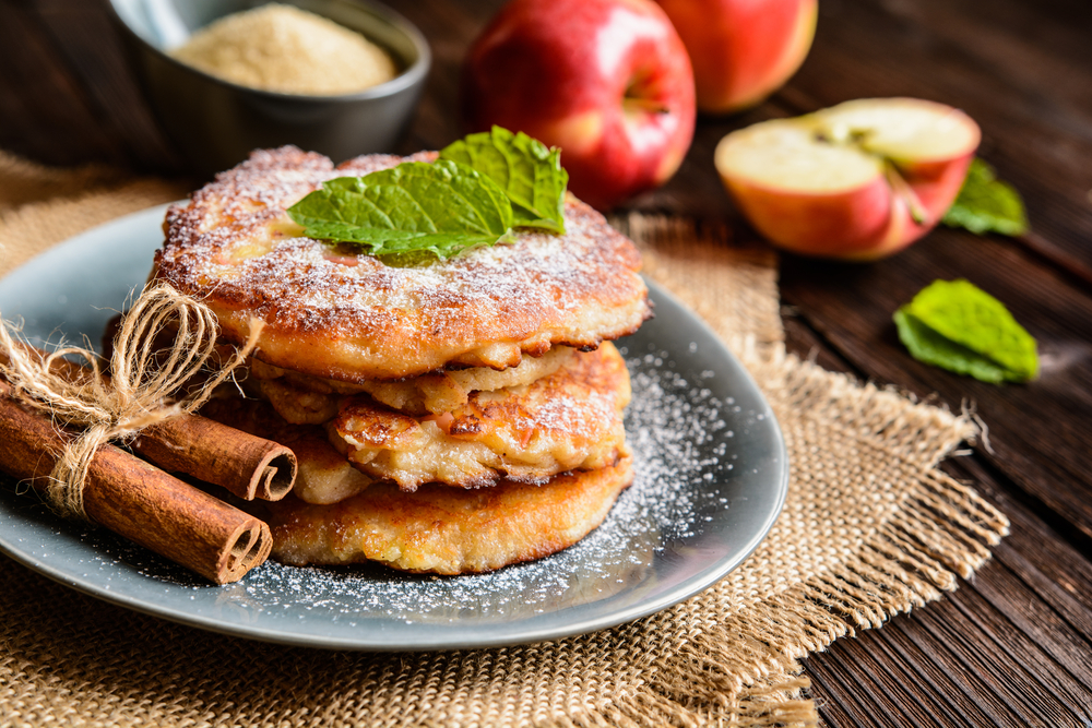 - Σε ένα μεγάλο τηγάνι σε μέτρια φωτιά, λιώστε μισό κουταλάκι του γλυκού βούτυρο. Πάνω από μία φέτα μήλου, βάλτε μία κουταλιά από το μείγμα και αφήστε να κυλήσει στο μπολ. Τοποθετήστε την τηγανίτα και κάντε το και με άλλες δύο. Ψήστε μέχρι να πάρουν χρυσαφί απόχρωση και σερβίρετε αμέσως.