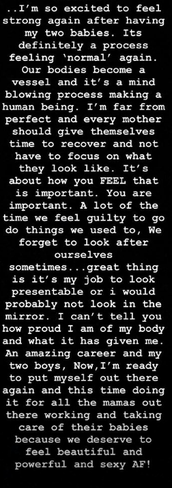 Τώρα είμαι έτοιμη να βγω πάλι εκεί έξω και αυτή τη φορά θα το κάνω για όλες τις μαμάδες εκεί έξω, οι οποίες δουλεύουν και φροντίζουν τα μωρά τους… Επειδή αξίζουμε να νιώθουμε όμορφες και δυνατές και σέξι!”.