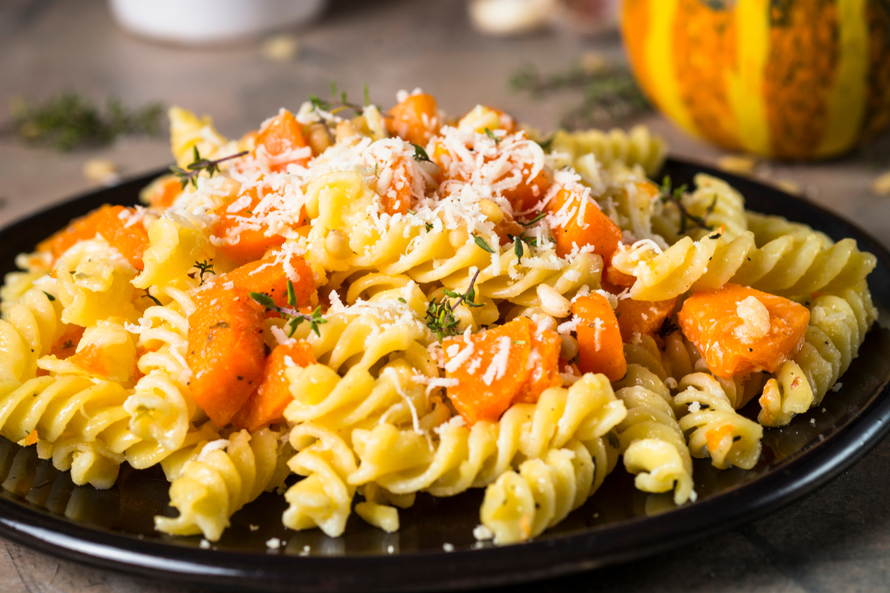Βράζετε τις πένες σε αλατισμένο νερό και τις σουρώνετε. Παράλληλα, καθαρίζετε την κολοκύθα, τη βράζετε μέχρι να μαλακώσει και την κάνετε πουρέ. Έπειτα, σοτάρετε στο ελαιόλαδο το σκόρδο και το κρεμμύδι ψιλοκομμένα και τα σβήνετε με το κρασί. Προσθέτετε στα παραπάνω τον πουρέ κολοκύθας, το βασιλικό, την παρμεζάνα, νερό, αλάτι και πιπέρι, ανακατεύετε και περιμένετε να δέσουν τα υλικά. Ρίχνετε στην κρέμα κολοκύθας τα βρασμένα ζυμαρικά και σερβίρετε.