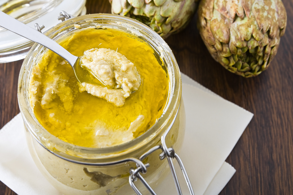 Ψήνετε τις καρδιές από τις αγκινάρες στο λαδόχαρτο στον φούρνο. Όταν μαλακώσουν και κρυώσουν, τις βάζετε στο μπλέντερ μαζί με όλα τα υλικά και τα χτυπάτε μέχρι να γίνει ένα ομοιογενές μείγμα. Αν θέλετε, μπορείτε να προσθέσετε και λίγο λεμόνι ή ξίδι για πιο πικάντικη γεύση.