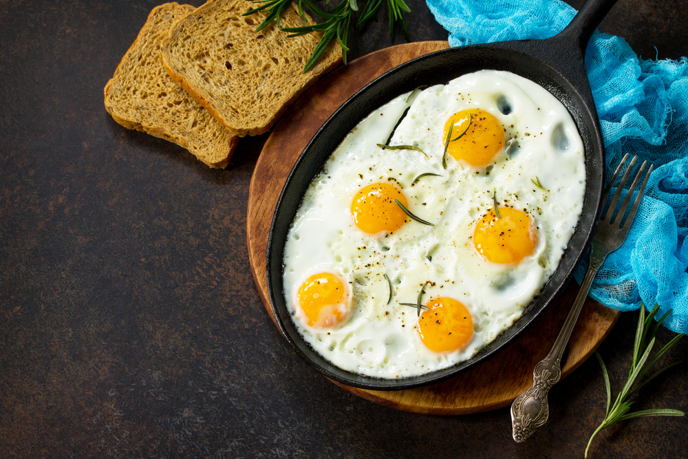 - Ρίξτε από πάνω τα 4 αυγά σε διαφορετικά σημεία και καλύψτε το τηγάνι για 4 λεπτά μέχρι να μαγειρευτούν τα αυγά. Ρίξτε θυμάρι και σερβίρετε με ψωμί του τοστ.