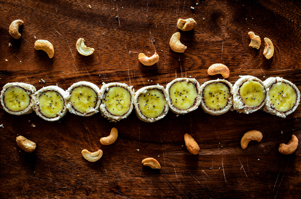 Ξεφλουδίστε την μπανάνα και βάλτε την πάνω από την πραλίνα.