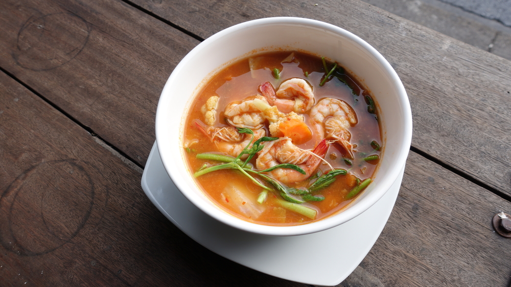 Tρίβετε το κρεμμύδι στον τρίφτη. Πολτοποιείτε το σκόρδο. Λιώνετε τη φέτα με το πιρούνι. Σοτάρετε στο λάδι το σκόρδο και το κρεμμύδι. Προσθέτετε τις γαρίδες και σβήνετε με τον ντοματοχυμό. Προσθέτετε 5 φλιτζάνια νερό και αφήνετε το φαγητό να βράσει για 20 λεπτά. Πριν το κατεβάσετε από τη φωτιά, ρίχνετε τη φέτα και περιμένετε να λιώσει. H σούπα σερβίρεται ζεστή.