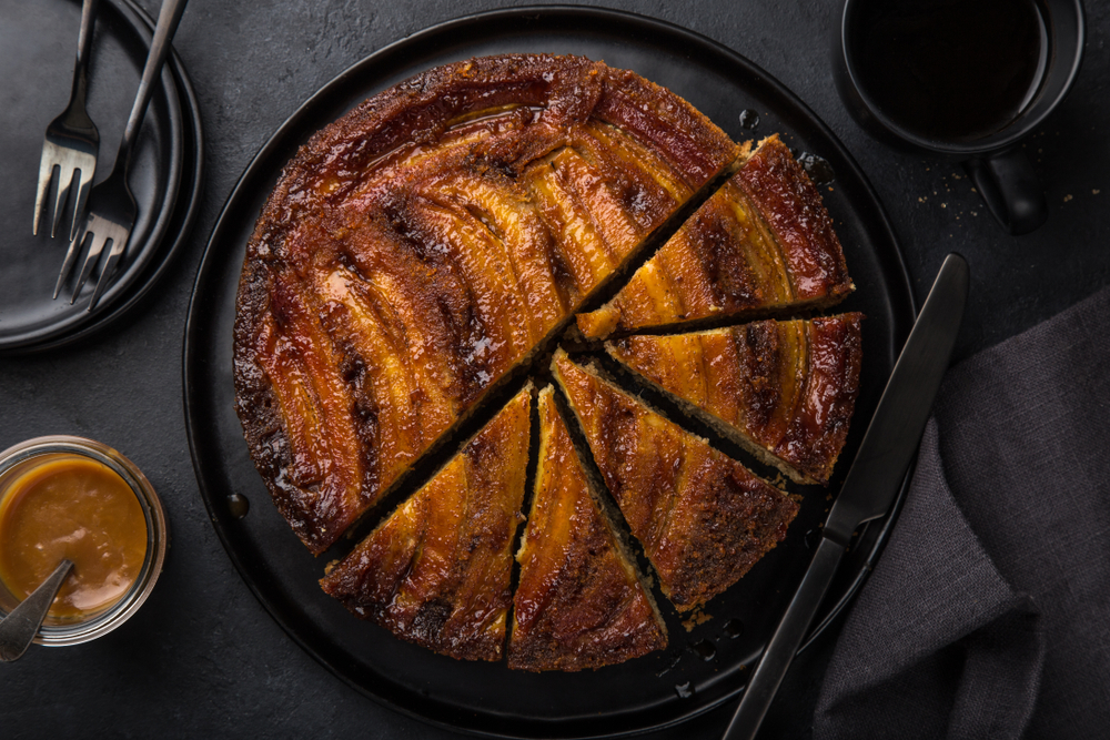 - Για να κάνετε τη ζύμη, βάλτε όλα τα υλικά σε ένα μπολ με ελάχιστο αλάτι. Χτυπήστε τα με ένα μίξερ σε χαμηλή ταχύτητα μέχρι να έχετε ένα απαλό μείγμα. Ρίξτε τη ζύμη πάνω από τις μπανάνες ώστε να είναι ομοιόμορφη. Ψήστε στο φούρνο για 1 ώρα περίπου και αφήστε το να κρυώσει. Γυρίστε στο ανάποδα.
