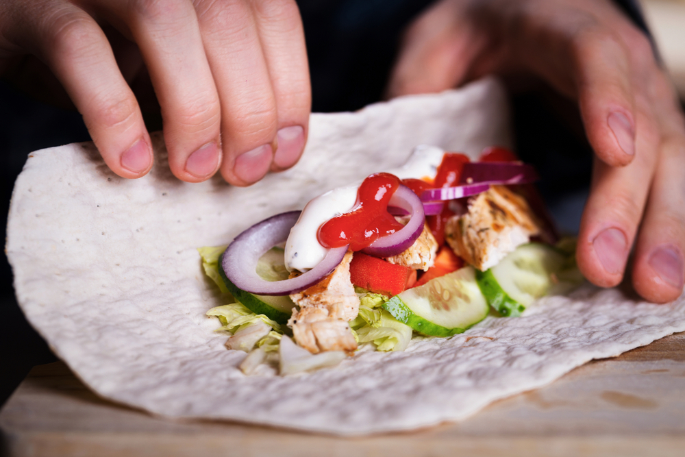 2. Μοιράστε το αβοκάντο και το κόλιανδρο στις πίτες και προσθέστε το μείγμα της γαλοπούλας. Ολοκληρώστε με ξινόκρεμα ή γιαούρτι.