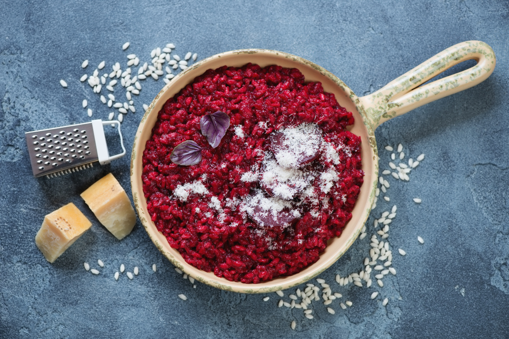 2. Σε ένα τηγάνι βάζετε το ελαιόλαδο, σοτάρετε ελαφρά το σκόρδο που έχετε πολτοποιήσει, ρίχνετε το ρύζι, τα παντζάρια, τη ρίγανη, αλάτι, ανακατεύετε και σβήνετε με το κρασί. Αφού εξατμιστεί προσθέτετε λίγο από τον ζωμό των παντζαριών ανακατεύοντας συνέχεια το ριζότο μέχρι να σωθεί ο ζωμός και επαναλαμβάνετε προσθέτοντας σιγά τον ζωμό μέχρι να τον πιει όλον.