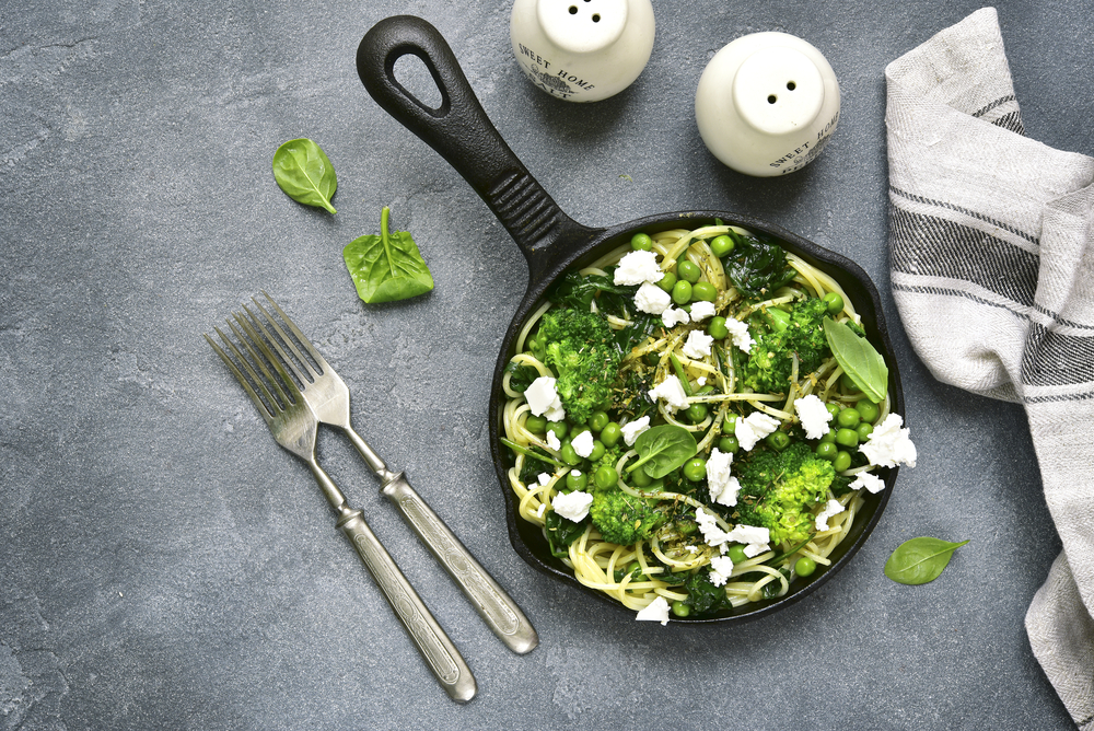 Βράστε τα σπαγγέτι και κρατήστε ένα μικρό φλιτζάνι από το νερό τους. Ρίξτε τα υπόλοιπα υλικά στο τηγάνι, προσθέστε τα σπαγγέτι και σερβίρετε με παρμεζάνα