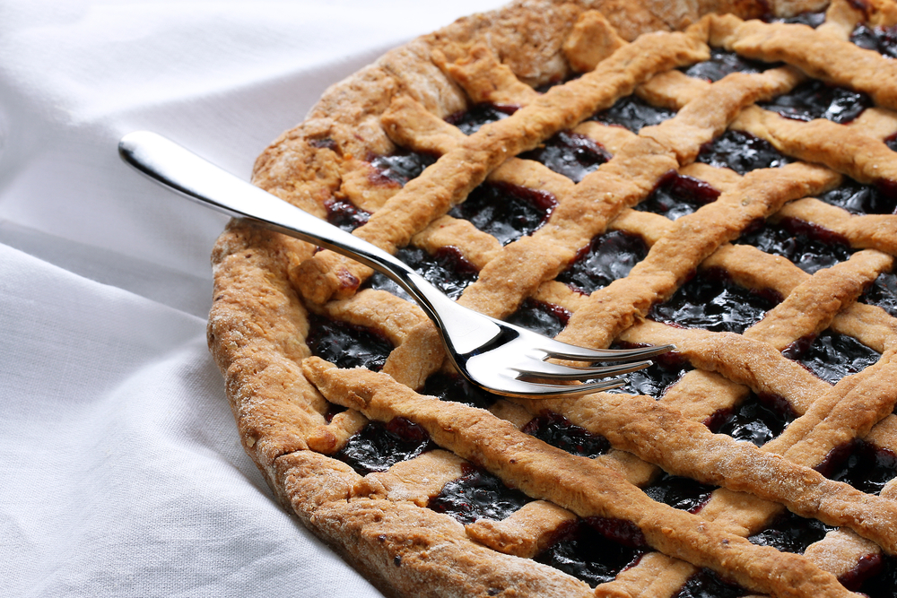 Χτυπάτε στο μίξερ το ελαιόλαδο, το χυμό πορτοκαλιού, το κονιάκ, τη ζάχαρη και το ξύσμα πορτοκαλιού, μέχρι το μείγμα να γίνει ομοιόμορφο. Χαμηλώνετε ταχύτητα στο μίξερ, προσθέτετε σταδιακά το αλεύρι και χτυπάτε 1-2 λεπτά. Παίρνετε τα 2/3 της ζύμης, την απλώνετε σε μια ταρτιέρα και ρίχνετε από πάνω τη μαρμελάδα. Κόβετε την υπόλοιπη ζύμη σε λωρίδες, που τις τοποθετείτε κάθετα και οριζόντια πάνω από τη μαρμελάδα. Ψήνετε το γλυκό στο φούρνο, στους 180° C, μέχρι να ροδίσει.