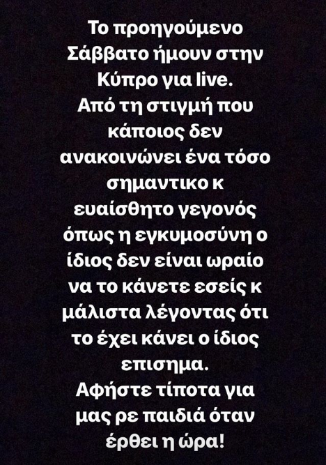 «Το προηγούμενο Σάββατο ήμουν στην Κύπρο για live. Από τη στιγμή που κάποιος δεν ανακοινώνει ένα τόσο σημαντικό και ευαίσθητο γεγονός, όπως η εγκυμοσύνη, ο ίδιος, δεν είναι ωραίο να το κάνετε εσείς. Και μάλιστα, λέγοντας ότι το έχει κάνει ο ίδιος επίσημα. Αφήστε τίποτα για εμάς ρε παιδιά όταν έρθει η ώρα».