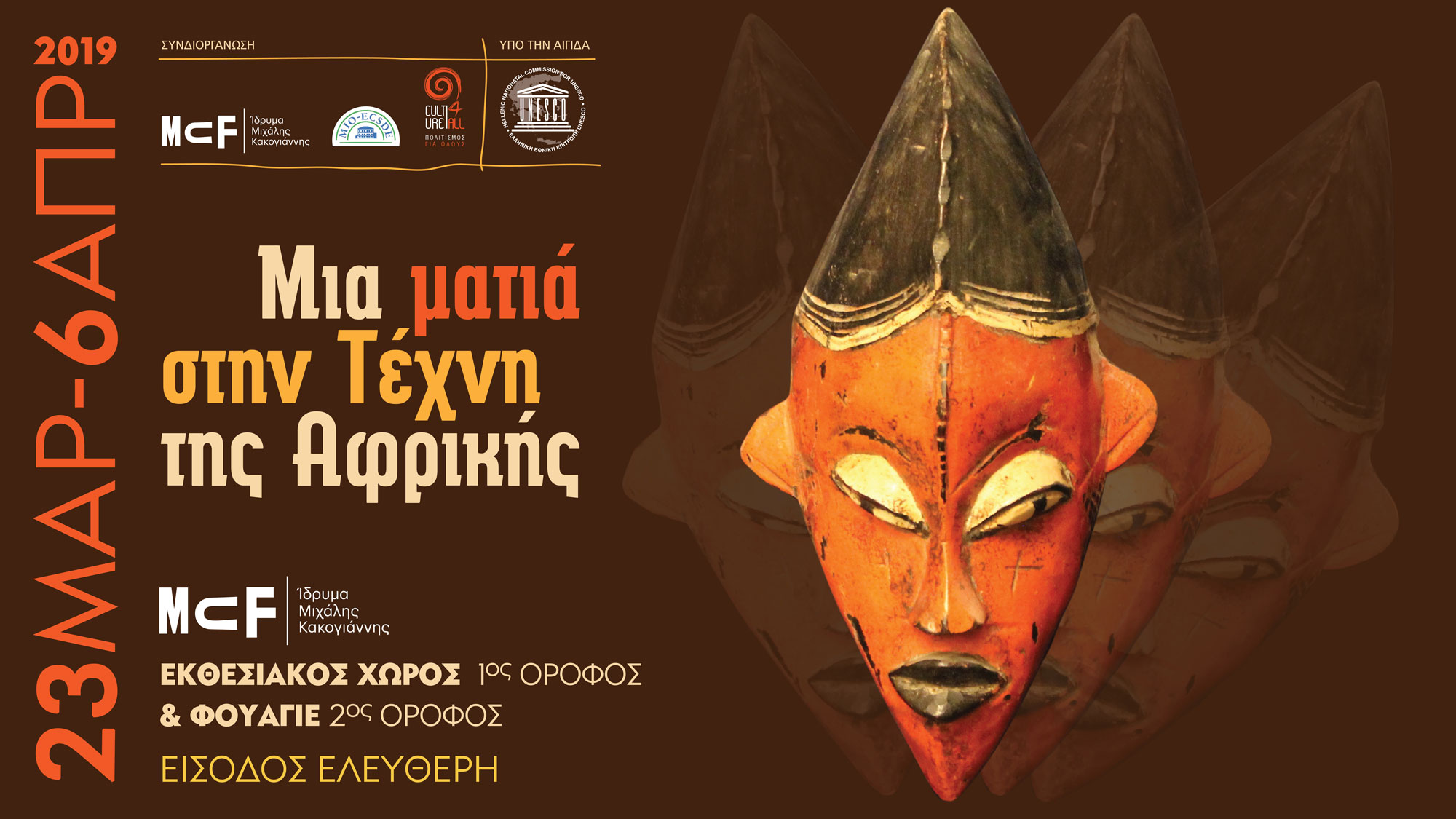 Το Ίδρυμα Μιχάλης Κακογιάννης, ο Πολιτιστικός Σύλλογος Culture4All – Πολιτισμός για Όλους και το Mediterranean Information Office for Environment, Culture and Sustainable Development (MIO-ECSDE) διοργανώνουν την έκθεση «Μια ματιά στην Τέχνη της Αφρικής» υπό την αιγίδα της Ελληνικής Εθνικής Επιτροπής UNESCO .