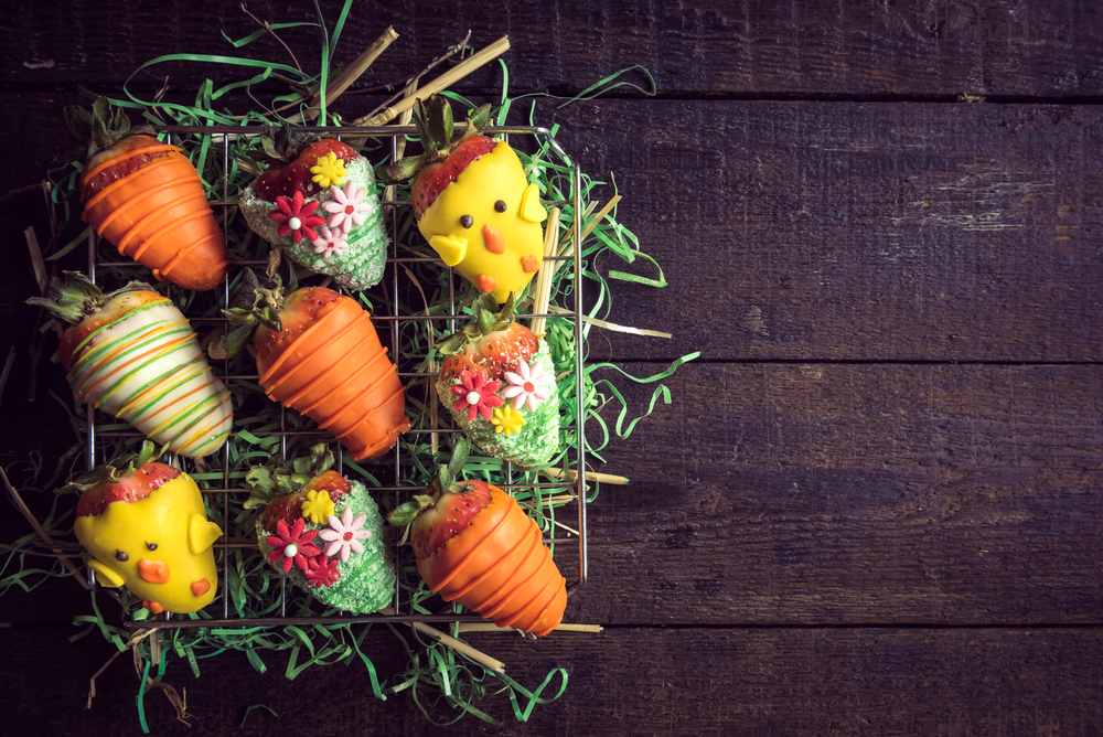 3. Φτιάξτε το γλάσο για διακόσμηση. Βάλτε το άλλο φλιτζάνι με τις σταγόνες και το κουταλάκι με λάδι καρύδας στο φούρνο μικροκυμάτων μέχρι να λιώσουν. Ξαναχωρίστε το μείγμα σε 4 μπολ και βάλτε πάλι χρώματα. Μεταφέρτε τις βαμμένες σοκολάτες σε πλαστικές σακούλες για κορνέ. Κάντε σχεδιάκια στις φράουλες σε πασχαλινή εκδοχή και ξαναβάλτε τις στο ψυγείο.