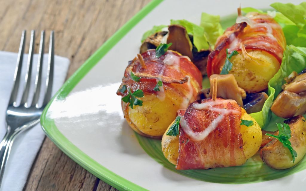 Πλένετε και καθαρίζετε τις πατάτες. Στη συνέχεια τις βάζετε σε ένα ταψί, τις αλείφετε με λίγο λάδι και τις πασπαλίζετε με ρίγανη. Ψήνετε σε προθερμασμένο φούρνο στους 200° C για περίπου 40′-50′, μέχρι να ροδίσουν. Μόλις ετοιμαστούν τυλίγετε τις πατάτες με τις φέτες απ’ το μπέικον, καρφώνετε με οδοντογλυφίδα και τις ξαναβάζετε στο φούρνο ή στο γκριλ για λίγο,μέχρι να ροδίσει και το μπέικον.