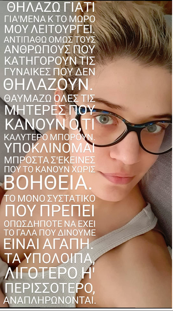 Ωστόσο, τις τελευταίες μέρες φαίνεται να έχει διαβάσει πολλά αρνητικά σχόλια για τις μανούλες που δε θηλάζουν και έτσι αποφάσισε να πάρει θέση επί του θέματος.