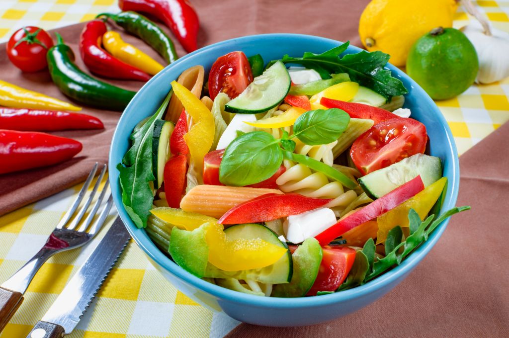 Γεμίστε μία κατσαρόλα με νερό και αφού ρίξετε λίγο αλάτι βράστε τα μακαρόνια al dente (1 λεπτό λιγότερο από τον χρόνο που αναγράφεται στην συσκευασία). Μόλις ετοιμαστούν, σουρώνετε και ξεπλένετε με δροσερό νερό. Μέχρι να κρυώσουν καθαρίστε καλά τις πιπεριές, αφαιρέστε τους σπόρους και κόψτε τις σε λωρίδες. Τους σπόρους αφαιρέστε και από το αγγούρι. Πλύνετε καλά το ντοματίνια και κόψτε τα στην μέση. Έπειτα λιώστε τη φέτα στο φλιτζάνι χρησιμοποιώντας ένα πιρούνι. Μόλις κρυώσουν τα μακαρόνια βάλτε σε ένα μεγάλο μπολ και προσθέστε τα λαχανικά, τη φέτα και το μπαλσάμικο. Ανακατέψτε καλά και προσθέστε το βασιλικό, αφού τον ψιλοκόψετε.