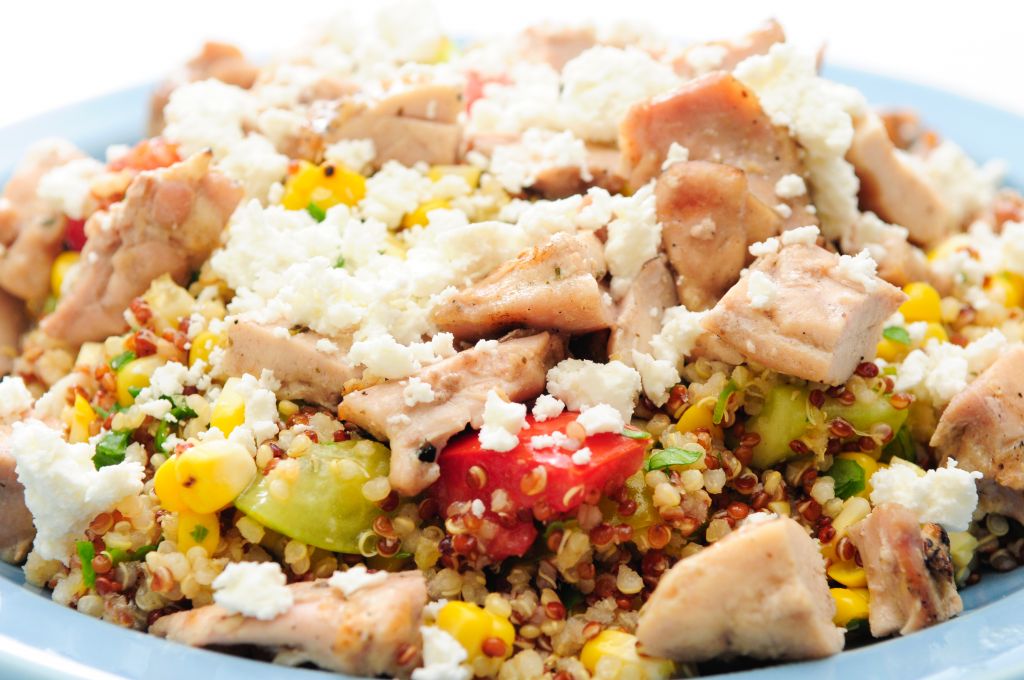 Ετοιμάστε την κινόα σύμφωνα με τις οδηγίες παρασκευής. Κόψτε στη συνέχεια τα λαχανικά σε μικρά κομμάτια και ανακατέψτε τα με την κινόα. Προσθέστε έπειτα τα υπόλοιπα υλικά και ανακατέψτε. Προσθέστε αλάτι και πιπέρι. Προαιρετικά εμπλουτίστε τη σαλάτα σας με λεμόνι και όσο φρέσκο κρεμμυδάκι θέλετε.