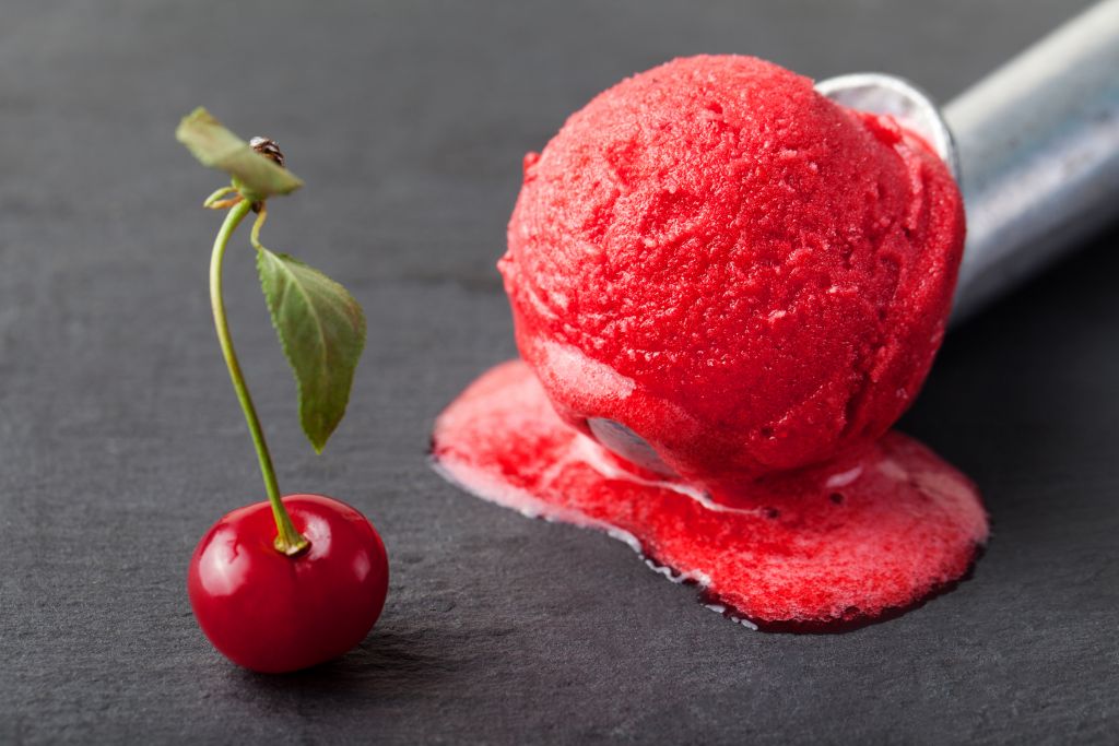 2. Χτυπάτε στο μίξερ τον πολτό κερασιού, το σιρόπι και τον χυμό λεμονιού. Μετά, αν έχετε παγωτομηχανή, συνεχίζετε την παρασκευή του σορμπέ σύμφωνα με τις οδηγίες του κατασκευαστή.