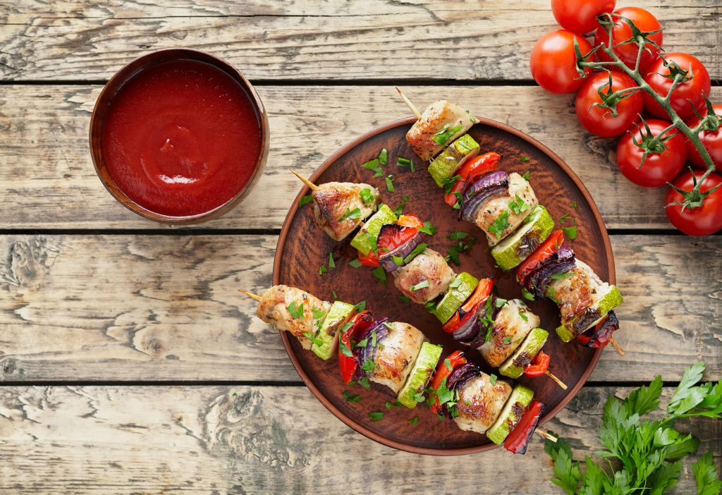 Σε ένα μπολ αναμείξτε τα υλικά για τη μαρινάδα, ανακατεύοντάς τα καλά με ένα σύρμα ώστε να ομογενοποιηθούν. Κόψτε τα κρεμμύδια και το κολοκύθι σε ροδέλες, τις πιπεριές σε χοντρές φέτες και τα τοματίνια και τα μανιτάρια στη μέση και περάστε τα κομμάτια των λαχανικών σε τέσσερα καλαμάκια, στο συνδυασμό της επιλογής σας. Με ένα πινέλο, αλείψτε τα σουβλάκια με τη μαρινάδα, τοποθετήστε τα σε ένα ταψί και βάλτε τα να ψηθούν για περίπου 10 λεπτά σε φούρνο που θα έχετε προθερμάνει στους 180 βαθμούς στο γκριλ. Μόλις πάρουν χρώμα, αφαιρέστε τα από τη φωτιά και απολαύστε τα.