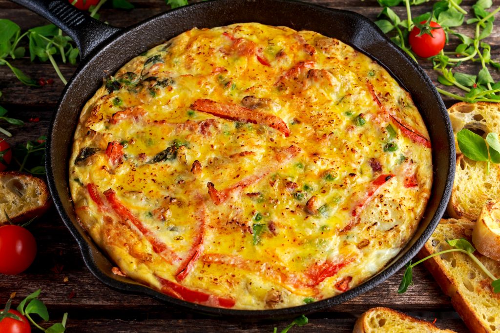 Προθερμάνετε τον φούρνο στους 180 βαθμούς. Σπάστε τα αυγά και χτυπήστε τα σε ένα μπολ, μαζί με το γάλα και τη μουστάρδα, σε περίπτωση που την χρησιμοποιήσετε. Προσθέστε στο μείγμα τα μισά υλικά και στη συνέχεια μεταφέρετέ το σε ένα λαδωμένο ταψάκι. Από πάνω προσθέστε και τα υπόλοιπα υλικά μας και βάλτε το ταψάκι στον φούρνο. Αφήστε το να ψηθεί μέχρι να ροδίσει ή για περίπου 20 με 25 λεπτά, και πριν το αποσύρετε από τη φωτιά ανάψτε για ένα με δύο λεπτά το γκριλ. Αφήστε την ομελέτα να κρυώσει για λίγο ώστε να μπορεί να κοπεί χωρίς να διαλυθεί. Είναι έτοιμη για να την απολαύσετε!