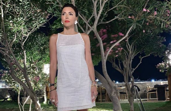 Η επιτυχημένη interior designer, γνωστή για την κομψή αισθητική της, φοράει ένα υπέροχο μπλε φόρεμα μαζί με χρυσά αξεσουάρ, ενώ η μικρή Διώνη είναι εξίσου στιλάτη φορώντας το λευκό φορεματάκι της.
