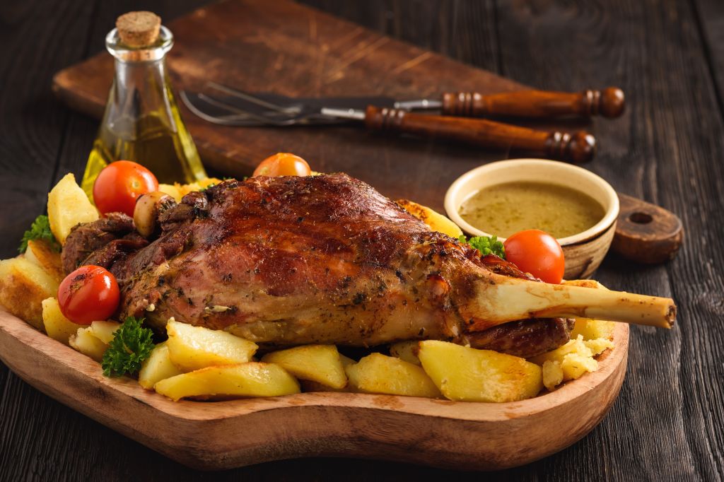 Με τα χέρια σας απλώστε στο κρέας τον χυμό του λεμονιού, λίγο ελαιόλαδο και τα μπαχαρικά. Πασπαλίστε με αλάτι και πιπέρι και με ένα μαχαιράκι ανοίξτε μερικές τρύπες στο κρέας για να καρφώσετε το δενδρολίβανο. Αφήστε το για μερικές ώρες στο ψυγείο να αρωματιστεί. Προθερμάνετε τον φούρνο στους 220 βαθμούς, βάλτε το κρέας σε ένα ταψί και περικυκλώστε το με τις πατάτες. Αλατίστε τις. Προσθέστε το ελαιόλαδο και το νερό και αφήστε το να ψηθεί για περίπου μία ώρα, γυρνώντας μία φορά το κρέας στη μέση του ψησίματος.