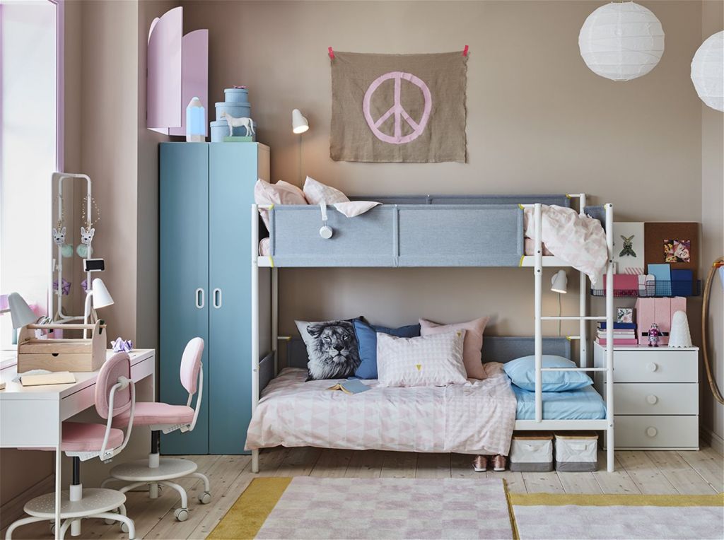 Οι κουκέτες παραμένουν σταθερά η καλύτερη λύση που έχετε στη διάθεσή σας. Μάλιστα, βάφοντας τον τοίχο σε διαφορετικά χρώματα και τοποθετώντας ράφια στο πλάι τους, μπορείτε να δημιουργήσετε την αίσθηση δύο ξεχωριστών δωματίων. Αν τα μικρά σας δεν αγαπούν τα… εναέρια όνειρα, εκτός από την κλασική κατοπτρική τοποθέτηση των επίπλων τους, μπορείτε να κολλήσετε το ένα κρεβάτι στην πλάτη του άλλου. Έτσι θα δημιουργήσετε και περισσότερο χώρο για παιχνίδι!
