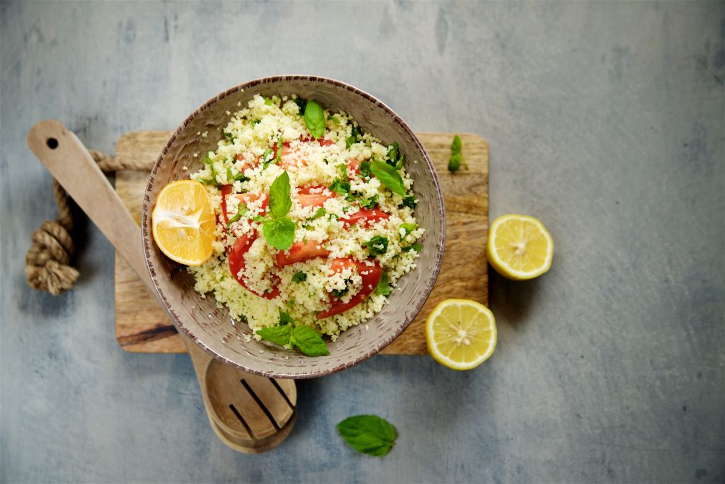 Βράστε το κους κους σε αλατισμένο νερό για περίπου 15 λεπτά ή μέχρι να μαλακώσει. Αφήστε το στην άκρη να κρυώσει. Στη βάση μιας σαλατιέρας απλώστε τη ρόκα αφού την χονδροκόψετε με τα χέρια σας. Με ένα πιρούνι λιώστε τη σκελίδα του σκόρδου. Κόψτε τα ντοματίνια στα τέσσερα και ψιλοκόψτε τον μαϊντανό. Ρίξτε τον μαϊντανό επάνω στη ρόκα, απλώστε από πάνω το κους κους, έπειτα τα ντοματίνια και τη σκελίδα του σκόρδου. Χτυπήστε το ελαιόλαδο με το λεμόνι και περιχύστε τη σαλάτα με το μείγμα σας. Προσθέστε αλάτι και πιπέρι. Η σαλάτα σας είναι έτοιμη!